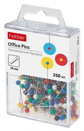 Булавки канцелярские Hatber 28мм с цветными головками 250шт в пластик.боксе с европодвесом