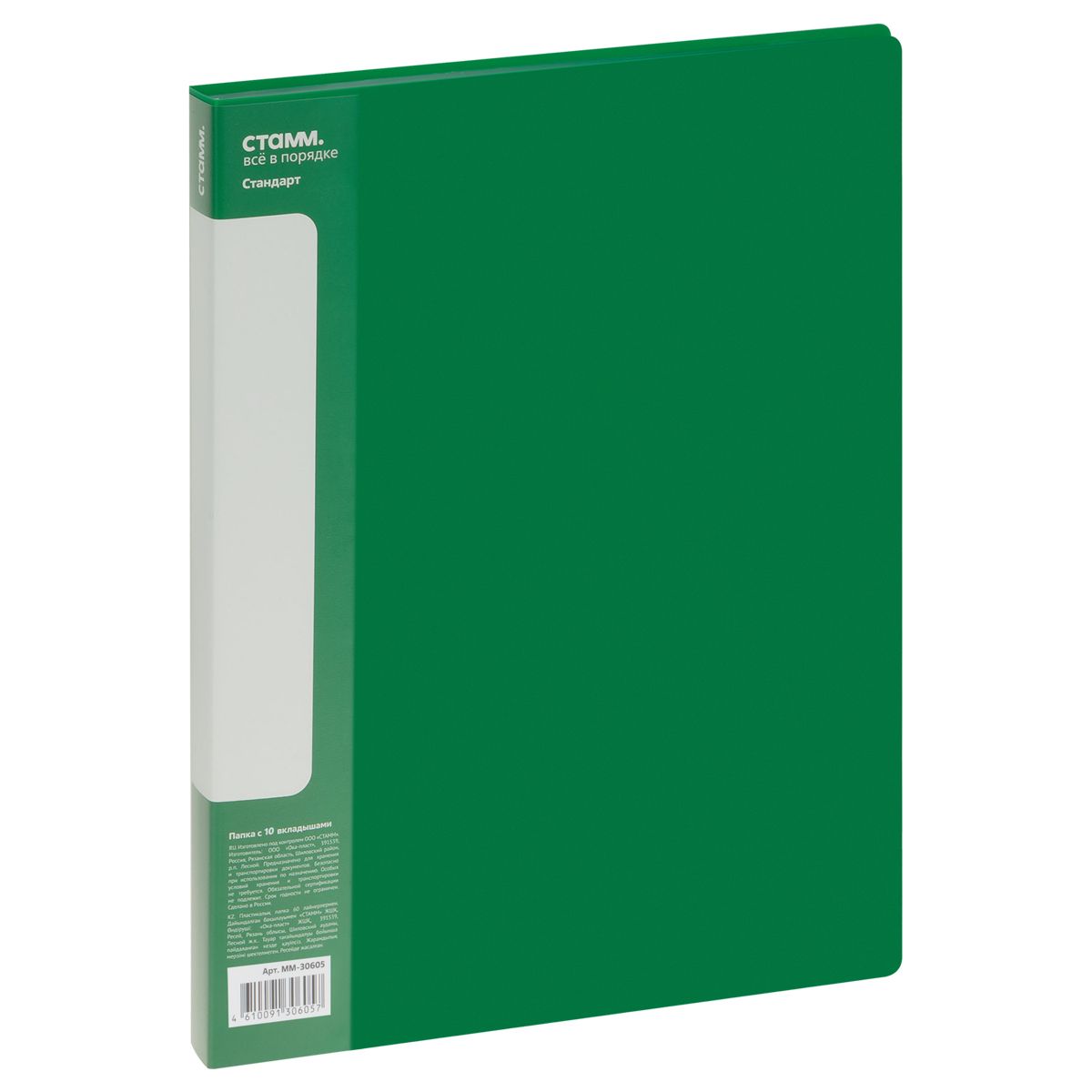 Папка с 10 вкладышами СТАММ "Стандарт" А4, 9мм, 600мкм, пластик, зеленая