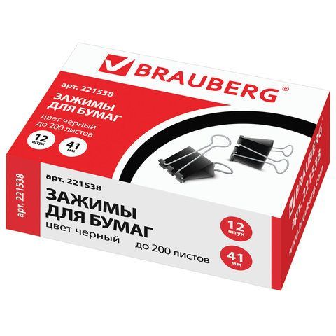 Зажимы для бумаг BRAUBERG, КОМПЛЕКТ 12 шт, 41 мм, на 200 листов, черные, карт.кор., 221538