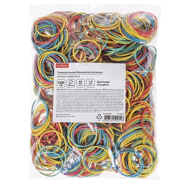 Резинка банковская цветная Hatber диаметр 38мм, длина 60мм, 500г в пакете