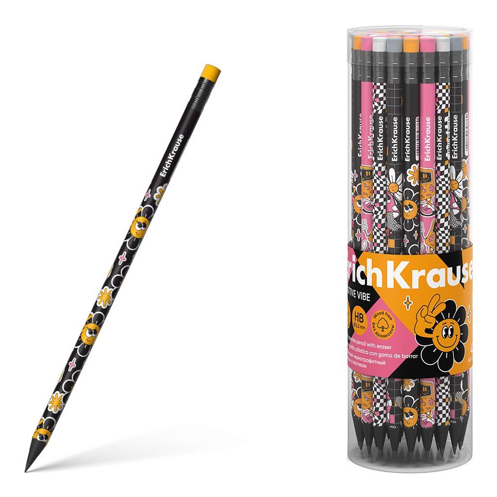 Чернографитный карандаш пластиковый ErichKrause Positive Vibe, круглый, с ластиком, НВ