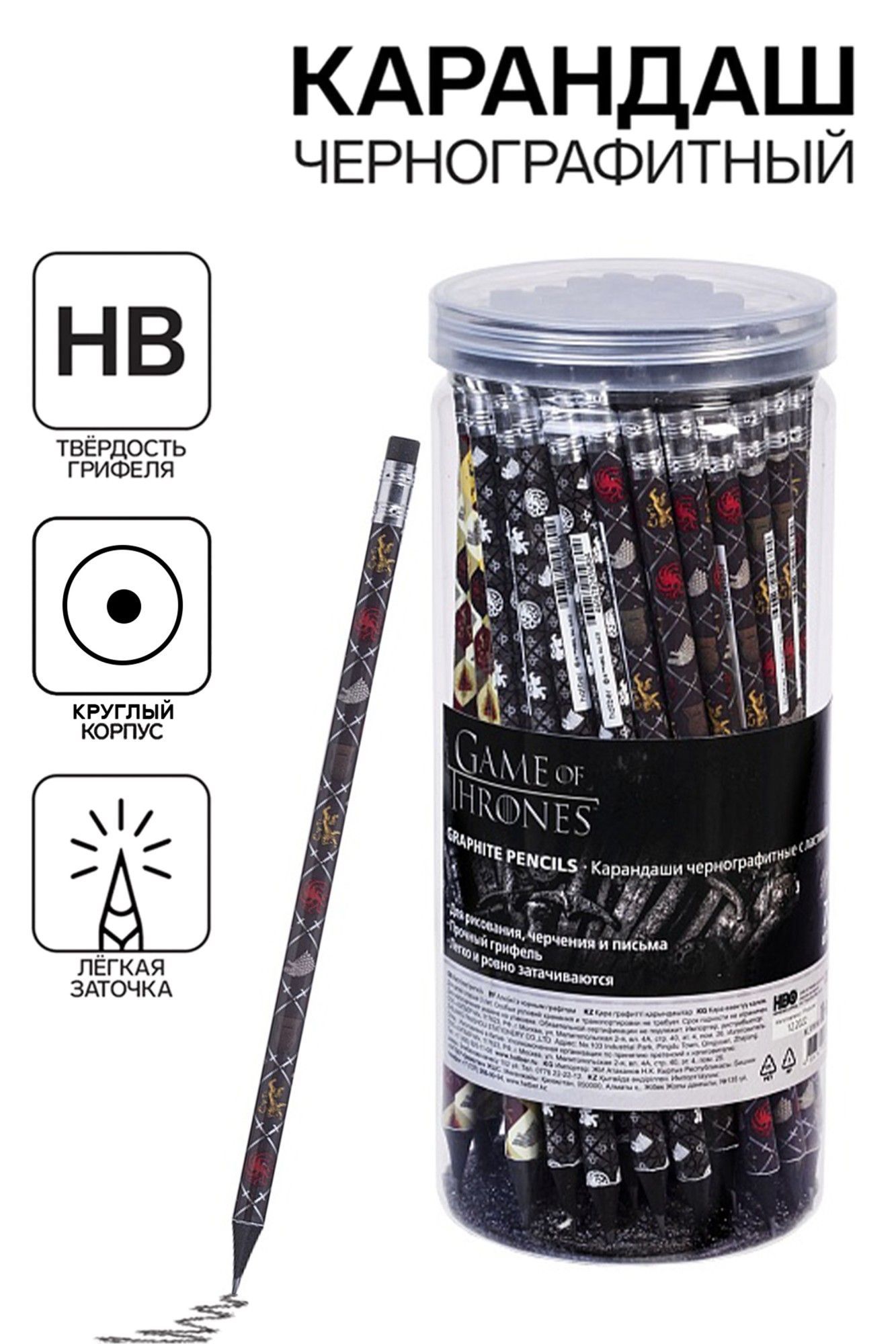 Карандаш чернографитный Hatber Игра престолов круглый Ассорти `HB` с ластиком