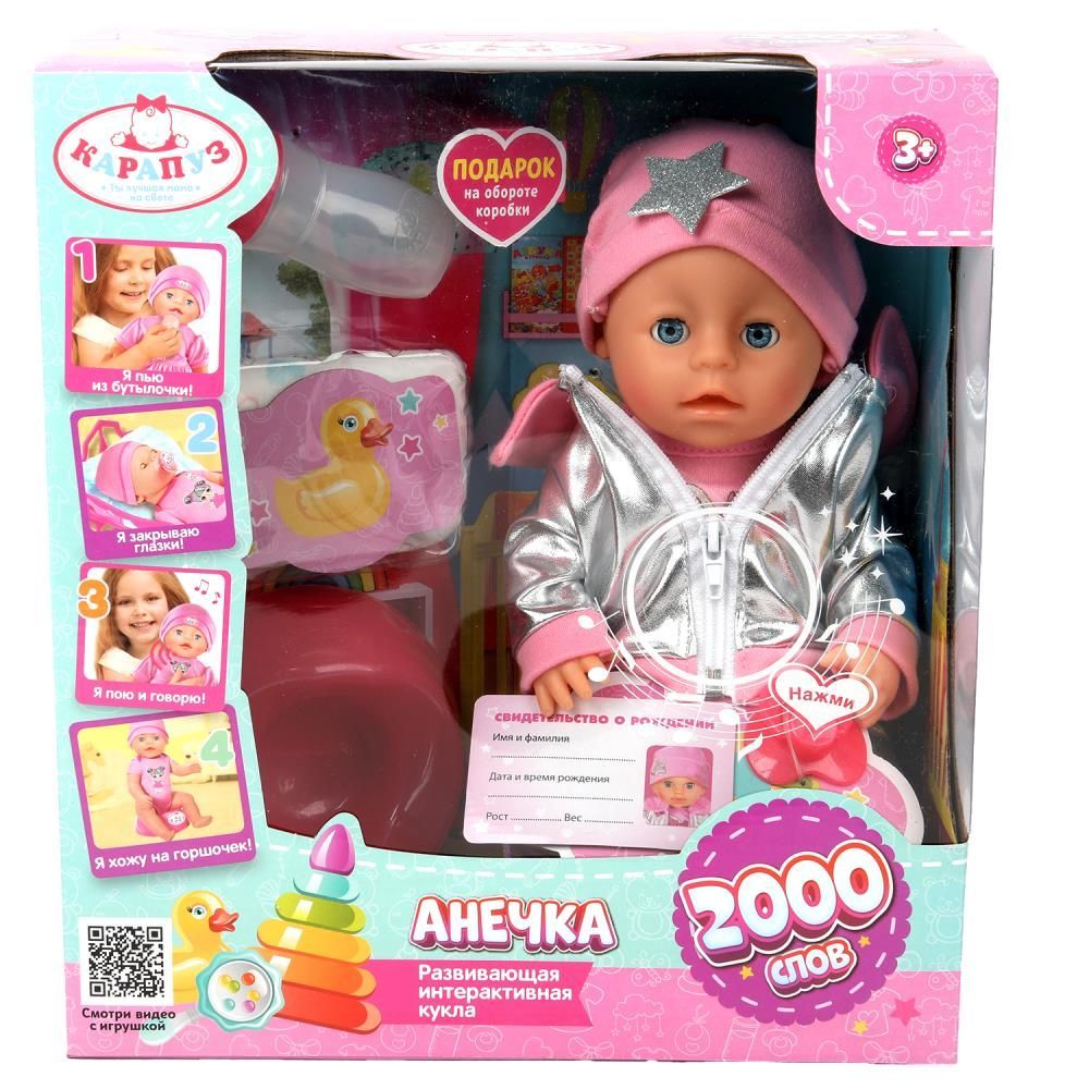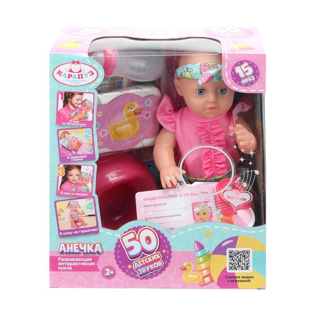 Пупс озвуч 40см, пьет, писает, закр. глазки, 4акс, 50 звуков КАРАПУЗ